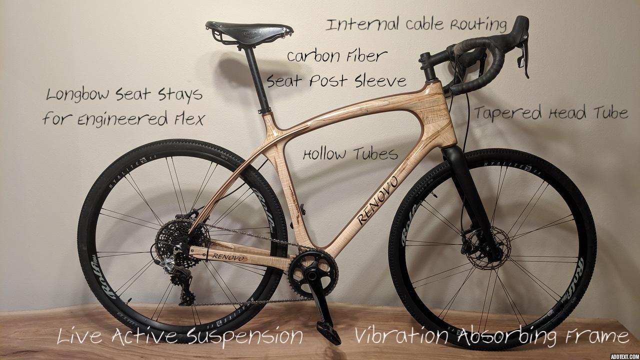 A Renovo frame is all wood, everywhere. Except where it is just air, like in the middle of the tubes. Oh, and in four very important places where the frame interfaces with the mechanical components, it's not wood there. At the seat tube, we use a carbon fiber seat tube sleeve. In the Head Tube, the wood wraps around a tapered aluminum head tube for the fork and bearings to sit in. At the bottom bracket, we use an aluminum T47 Threaded bottom bracket shell from PMW to support the bottom bracket and crank. And at the back of the rear triangle is a custom aluminum dropout for the rear axle, brake and derailleur. Other than that, it's all wood. And air.